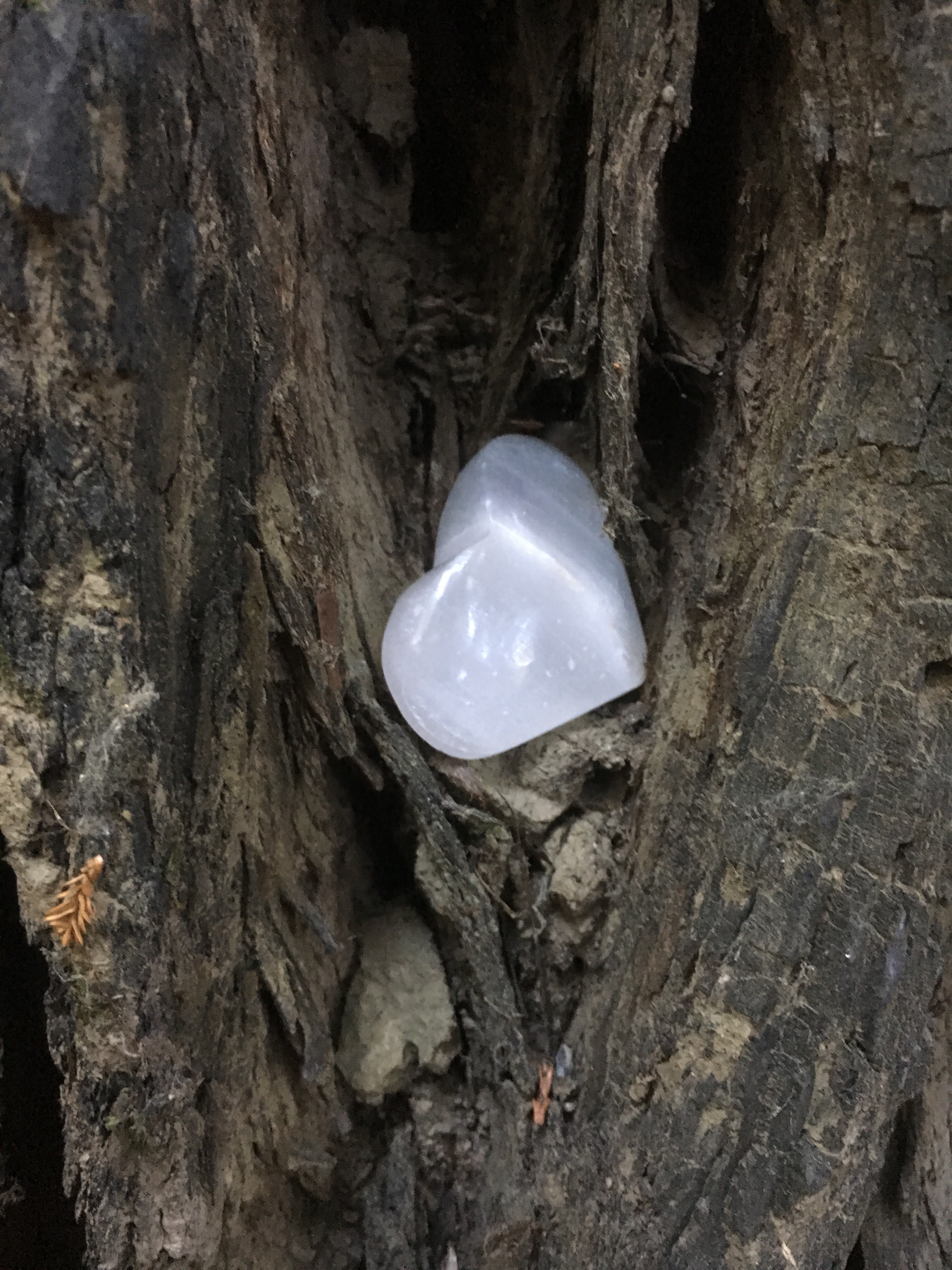PS vandaag zijn we zuidelijk gereisd via de Avenue of the Giants. Ik had een hart van seleniet mee om achter te laten in de buurt van Mount Shasta, maar was dit volstrekt vergeten. Deze heeft dus een heel mooi thuis gevonden in een eeuwenoude Redwoodboom, met wie ik vandaag nog een fijne communicatie had.