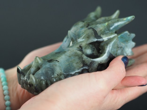 Vorige week werd me ingegeven dat de energetische drakenpoort** die ik enkele jaren geleden had geactiveerd, moest worden verplaatst en vergroot. Er zouden hoger dimensionale draken klaarstaan om met Lichtwerkers samen te werken en hiervoor was dus een transformatie en verplaatsing van de poort nodig. Dus ik heb vorige week met mijn drakengidsen samen dit mooie Lichtwerk gedaan. Ondertussen was er door twee verschillende mensen dezelfde link naar me gestuurd over een edelstenen drakenschedel die ze bij me vonden passen. ik was toch echt niet van plan er nog eentje aan te schaffen, want ik heb al een flinke clan staan. Maar diezelfde avond nog liet zich een heel etherische, zachtblauwe drakengids aan mij zien die aan de schedel gekoppeld was. Dus tja…wat doe je dan?