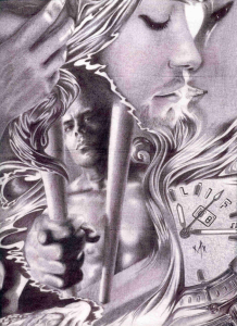 totems die je vaak ziet bij het Sjamanistisch werken, zoals dat van de Native Americans, want er lag een kristallijne draak op me te wachten. Ik ontving zowel een kristal voor mijn Lichtwerk met de kristallen als een veer om voort te gaan met schrijven. Er was een mense- lijke gestalte aanwezig. Hij deed me denken aan een Atlantische priester. Hij had een blauw gewaad aan en een kristallen scepter in zijn hand. Het voelde heel bekend, als een herinnering aan een Atlantisch leven.