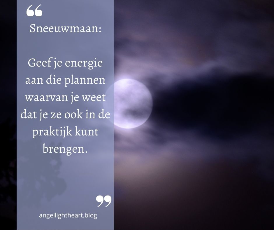 Ik vind dit altijd een magische volle maan, omdat dit de tijd is waarin bepaald wordt of zaadjes wel of niet uit gaan komen. Om die reden heeft de Sneeuwmaan als thema kiemkracht. De natuur is hard en niet elk zaadje dat op de aarde valt zal ontkiemen. Hetzelfde geldt voor onze plannen en ideeën. Niet ieder idee dat in ons opkomt, is praktisch uitvoerbaar. Deze maan is daarom een ideaal moment om te kijken naar onze plannen en daaruit te kiezen welke we willen uitvoeren en welke we willen uitstellen of laten vallen.