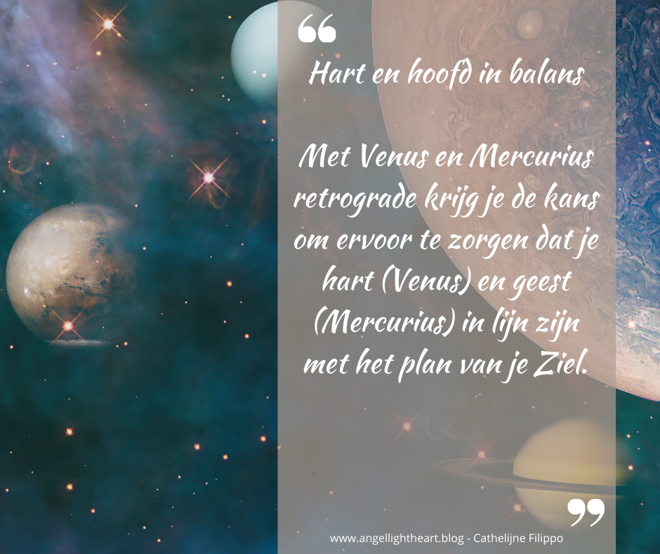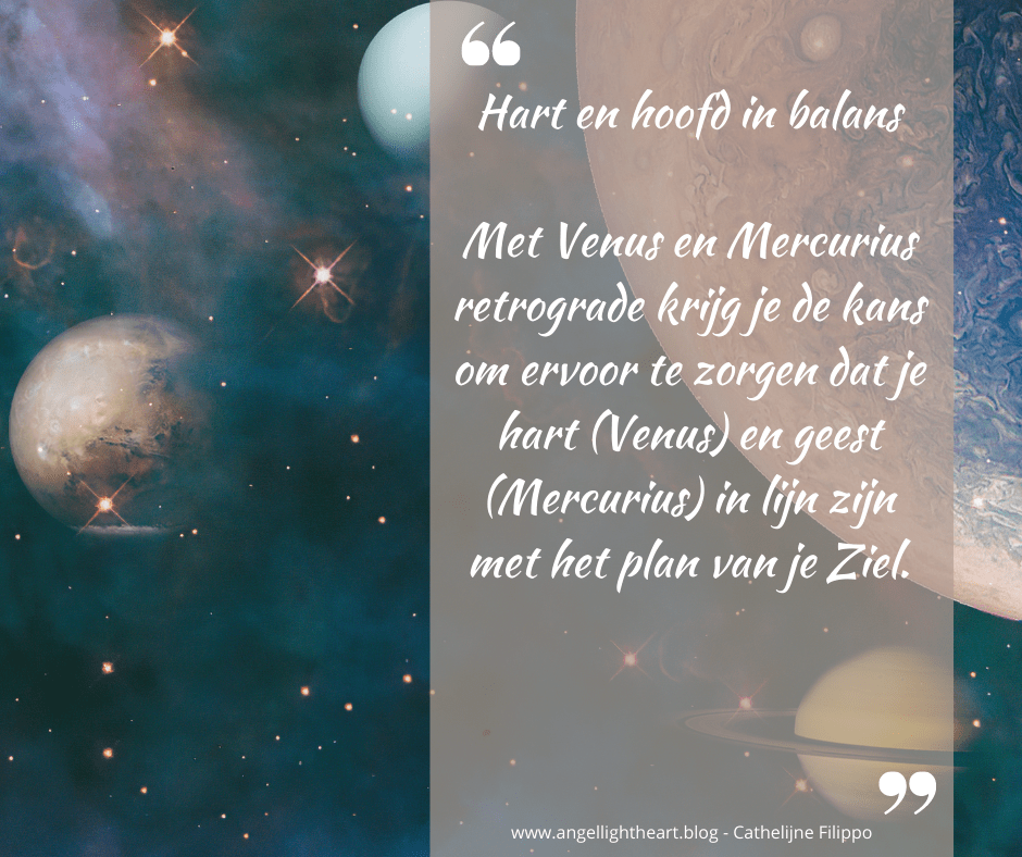 Het bijzondere van deze combinatie van retrogradeplaneten is dat ze je juist kunnen helpen bij wat er nu zo hard nodig is: je hart en mind in balans brengen. Met Venus en Mercurius retrograde heb je namelijk de kans om ervoor te zorgen dat je hart (Venus) en geest (Mercurius) in lijn zijn met het plan van je Ziel.