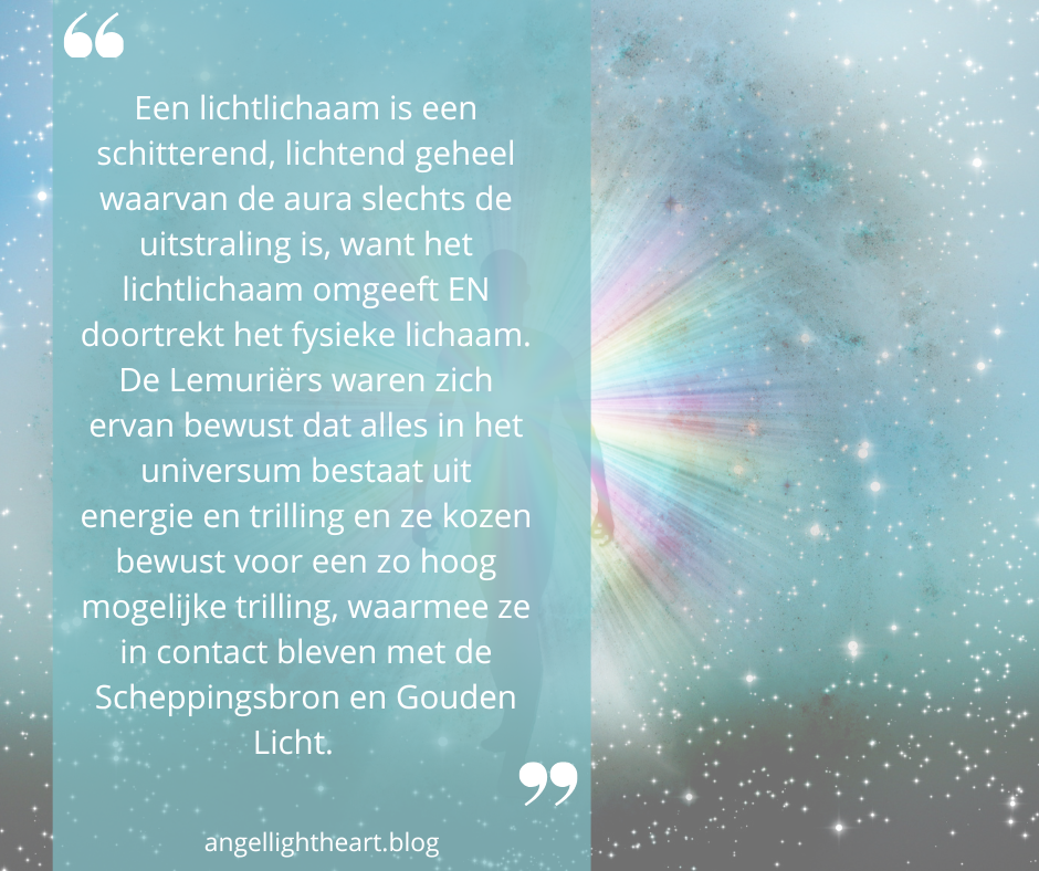 Het werkelijk bijzondere van de vroege Lemuriërs was dat ze zich volledig bewust waren van en verbonden bleven met hun spirituele wezen. Ze noemden hun spirituele lichaam hun lichtlichaam omdat deze voornamelijk uit Licht en energie bestond. Een lichtlichaam is een schitterend, lichtend geheel waarvan de aura slechts de uitstraling is, want het lichtlichaam omgeeft EN doortrekt het fysieke lichaam. De Lemuriërs waren zich ervan bewust dat alles in het universum bestaat uit energie en trilling en ze kozen bewust voor een zo hoog mogelijke trilling, waarmee ze in contact bleven met de Scheppingsbron en Gouden Licht.