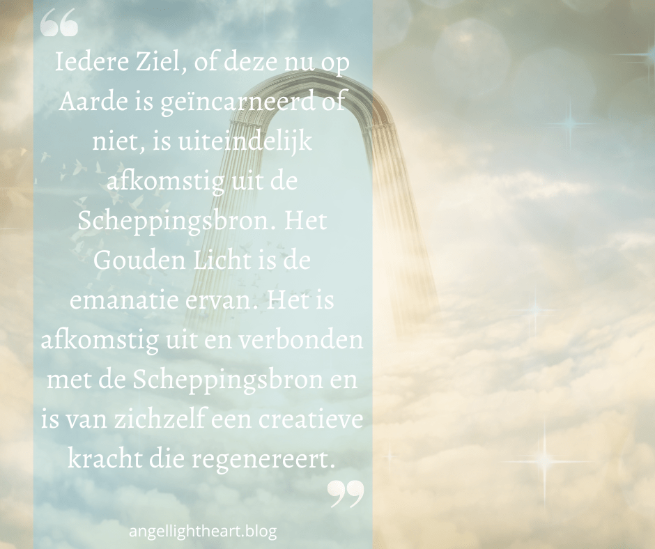 Alles wat zich manifesteert is afkomstig uit de Scheppingsbron. Of je deze Bron nu God noemt of de Schepper of wat ook, het blijven beperkte begrippen om de oneindige liefdevolle, intelligente energie ervan te beschrijven. Iedere Ziel, of deze nu op Aarde is geïncarneerd of niet, is uiteindelijk afkomstig uit de Scheppingsbron. Het Gouden Licht is de emanatie ervan. Het is afkomstig uit en verbonden met de Scheppingsbron en is van zichzelf een creatieve kracht die regenereert. Je kunt het je voorstellen als een oneindige stroom van energie en Licht vanuit de Scheppingsbron naar de fysieke wereld. Omdat het Gouden Licht de trilling en kracht van creatie bevat is het, volgens Lauren Thyme*, het sterkste licht van transformatie in het universum.
