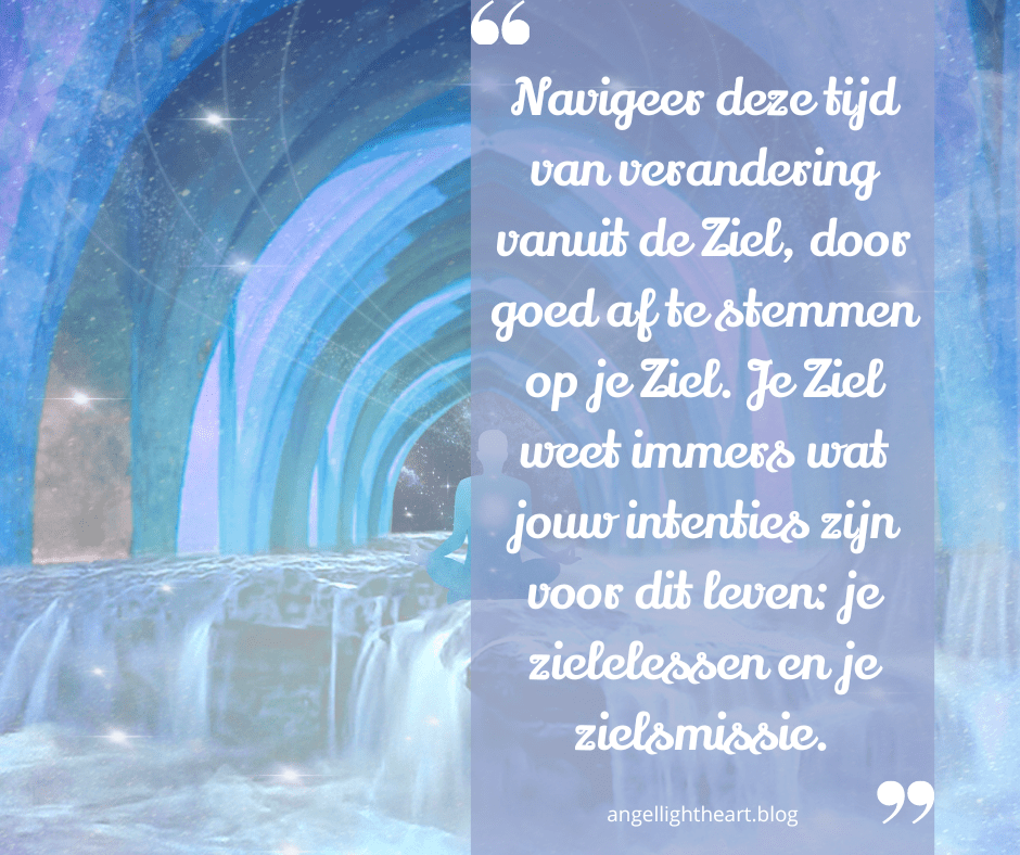 Deze tijd brengt de energie van verandering. De beste manier om verandering te navigeren is vanuit de Ziel of in goed contact met de Ziel. Je Ziel weet immers wat jouw intenties zijn voor dit leven: dat wat je komt leren (je zielelessen) en dat wat je bij komt dragen (je zielsmissie).