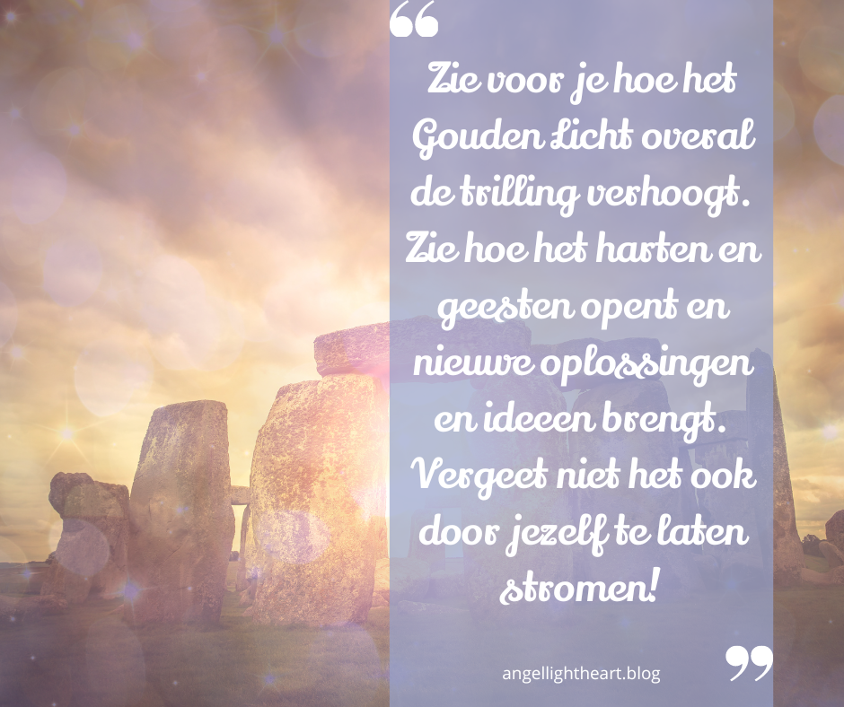 Zie voor je hoe het Gouden Licht overal de trilling verhoogt. Zie hoe het harten en geesten opent en nieuwe oplossingen en ideeen brengt. Vergeet niet het ook door jezelf te laten stromen!