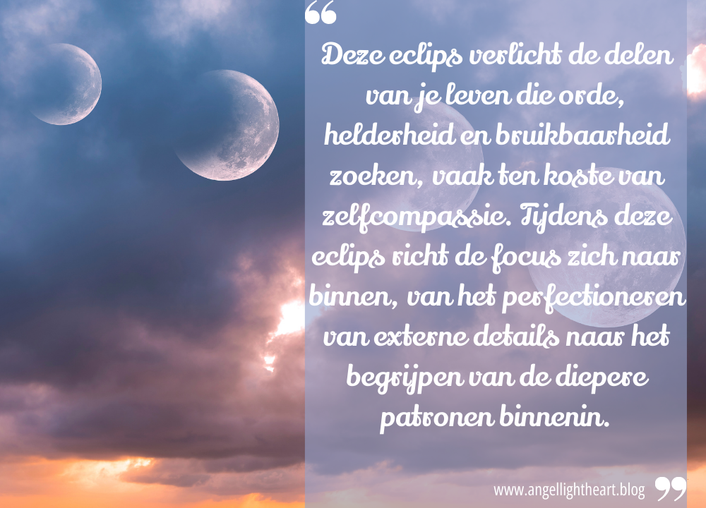 Op 14 maart markeert de totale maansverduistering niet alleen de afsluiting van een belangrijk hoofdstuk, maar luidt ook de eerste eclipspoort van het jaar in. Deze eclips verlicht de delen van je leven die orde, helderheid en bruikbaarheid zoeken, vaak ten koste van zelfcompassie. Tijdens deze eclips richt de focus zich naar binnen, van het perfectioneren van externe details naar het begrijpen van de diepere patronen binnenin. Je kunt ook openbaringen hebben over waar je te kritisch op jezelf bent geweest of vasthoudt aan harde oordelen die je welzijn niet ondersteunen. Het kan neigingen tot overdenken, overwerken of micromanagen blootleggen die je vasthouden in cycli van zorgen of twijfel aan jezelf. De energie nodigt uit tot bevrijding, niet alleen van taken of gewoontes, maar ook van de innerlijke stemmen en perfectionistische neigingen die zwaar op je hart drukken.