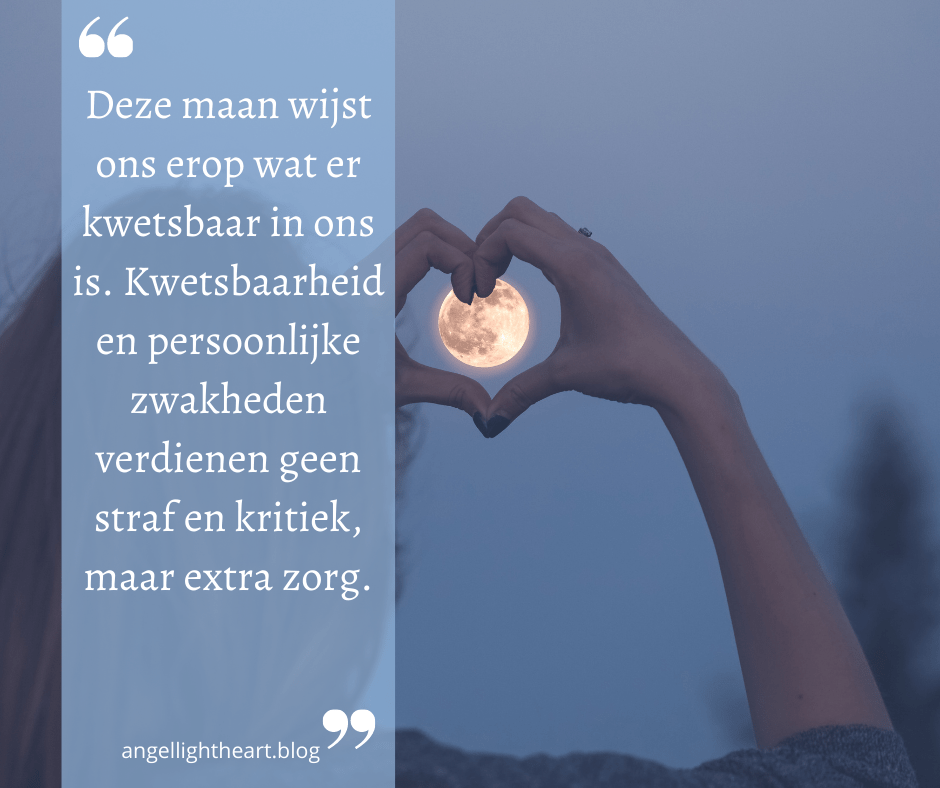 Deze maan wijst ons erop wat er kwetsbaar in ons is. Kwetsbaarheid en persoonlijke zwakheden verdienen geen straf en kritiek, maar extra zorg. Het is belangrijk onszelf deze periode de ruimte te geven oud leed te verwerken. Onze geest mag rust krijgen. De winter is een tijd van naar binnen keren, energie verzamelen om in de lente weer tot bloei te kunnen komen. Ieder jaargetijde heeft zijn eigen energie en het is onverstandig in de winter te willen bloeien en groeien. Om de komende lente goed in te kunnen gaan, vraagt de winter van ons dat we alle zaken loslaten die ons hogere goed niet langer dienen. Dat we emotioneel gezien tijd nemen voor verwerking. We mogen de tijd nemen voor rust, zelfzorg en waar nodig herstel.
