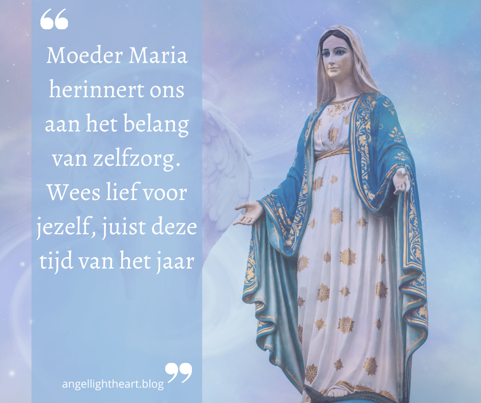• Voor je verschijnt een figuur van schitterend zacht aquamarijnblauw licht. Wanneer dit wezen dichterbij komt, zie je dat het Moeder Maria is, de Koningin van alle engelen. Maria is de overziel van de Moeder van Jezus en haar engelen brengen heling en compassie. Zie hoe haar engelen liefdevol om je heen gaan staan en vanuit hun harten en handen heling naar jou toe sturen, terwijl Maria je liefdevol aankijkt. Ze kent je ‘fouten’ als mens maar ziet de perfectie van je Ziel. Ze straalt dit uit en vraagt je je hart te openen voor jezelf en jezelf te bejegenen met liefde, respect en compassie. Zie je hart als een bloem met 33 blaadjes en open één voor één deze blaadjes.