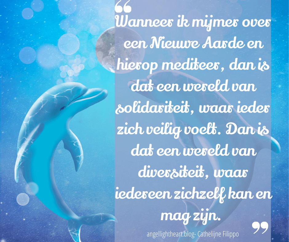 Wanneer ik mijmer over een Nieuwe Aarde en hierop mediteer, dan is dat een wereld van solidariteit, waar ieder zich veilig voelt. Dan is dat een wereld van diversiteit, waar iedereen zichzelf kan en mag zijn. Waar de ene etnische groep niet beter of minder is dan de andere. Waar eerlijkheid en waarachtigheid de norm zijn, maar ook liefdevolle vriendelijkheid. Waar gelijkheid is en we dus niet meer op hoeven te komen voor de ‘zwakkeren’ omdat dat onderscheid helemaal niet meer bestaat.